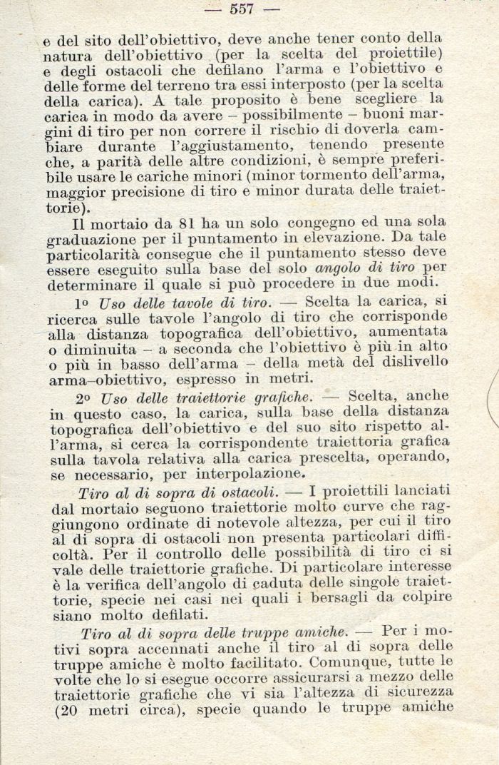 e del sito dell'obiettivo, deve anebe tener conto della natura dell'obiettivo (per la scelta del proiettile) e degli ostacoli cbe defilano l'arnia e l'obiettivo e dello forme del terreno tra essi interposto (per la scelta della carica). A tale proposito è bene scegliere la carica in modo da avere - possibilmente - buoni margini di tiro per non correre il rischio di doverla cambiare durante l'aggiustamento, tenendo presente che, a parità delle altre condizioni, è sempre preferibile usare le cariche minori (minor tormento dell'arma, maggior precisione di tiro e minor durata delle traiettorie).