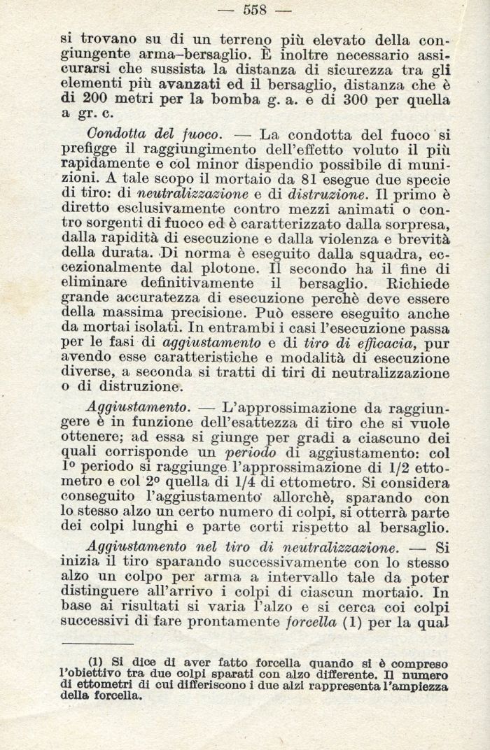 (1) Si dice di aver fatto forcella quando si è compreso l'obiettivo tra due colpi sparati con alzo differente. Il numero di ettometri di cui differiscono i due alzi rappresenta l'ampiezza della forcella.