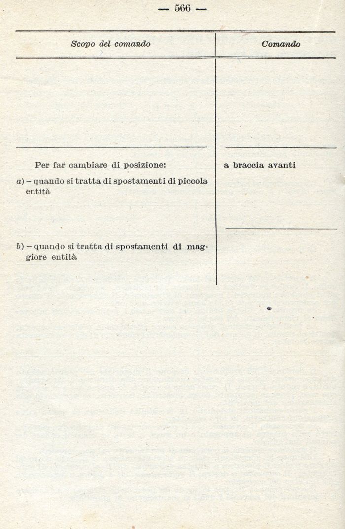 — 560 -- Scopo del comando Comando Per far cambiare di posizione: a braccia avanti a) - quando si tratta di spostamenti di piccola entità 6) - quando si tratta di spostamenti di mag- giore entità.