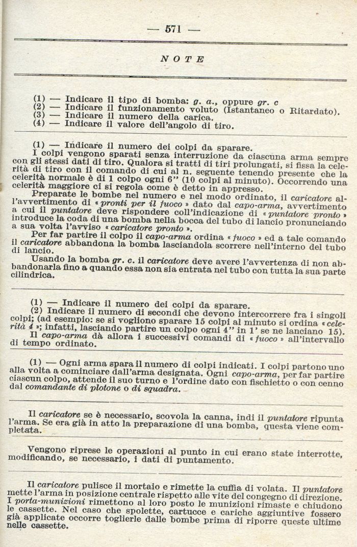 Preparate le bombe nel numero e nel modo ordinato, il caricatore all'avvertimento di « pronti per il fuoco » dato dal capo-arma, avvertimento a cui il puntatore deve rispondere coll'indicazione di « puntatore pronto • introduce la coda di una bomba nella bocca del tubo di lancio pronunciando a sua volta l'avviso « caricatore pronto ».