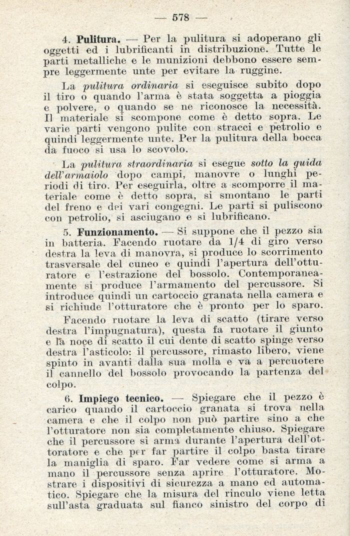 4. Pulitura. — Per la pulitura si adoperano gli oggetti ed i lubrificanti in distribuzione. Tutte le parti metalliche e le munizioni debbono essere sempre leggermente unte per evitare la ruggine.