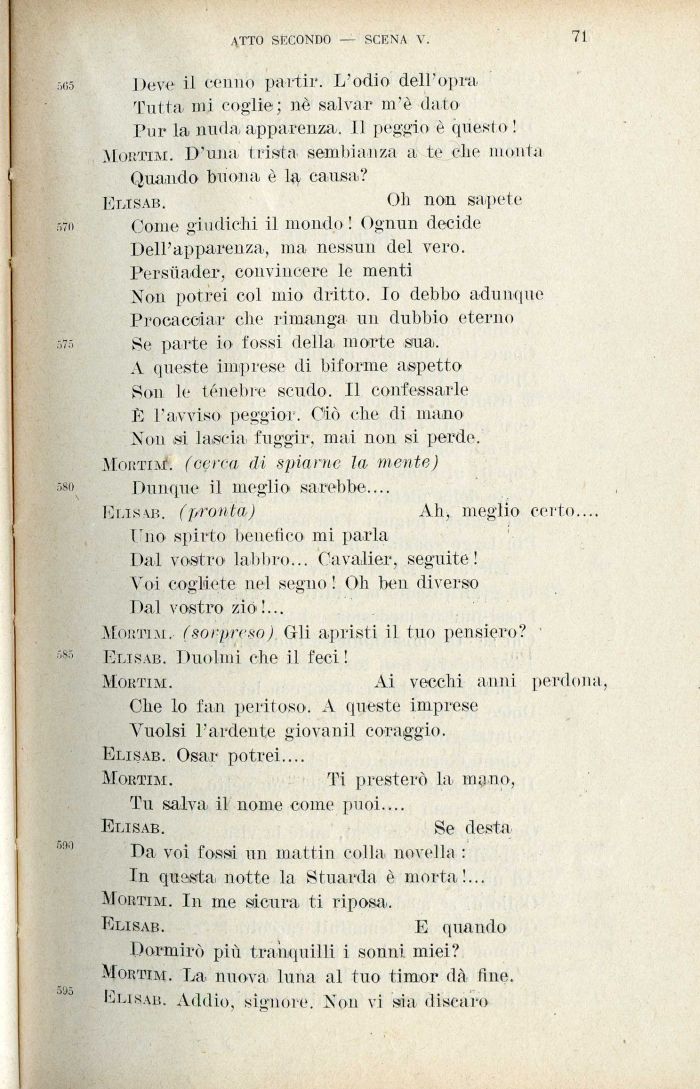 Dormirò più tranquilli i sonni miei? Mortim. La nuova luna al tuo timor dà fine. Elisab. Addio, signore. Non vi sia discaro