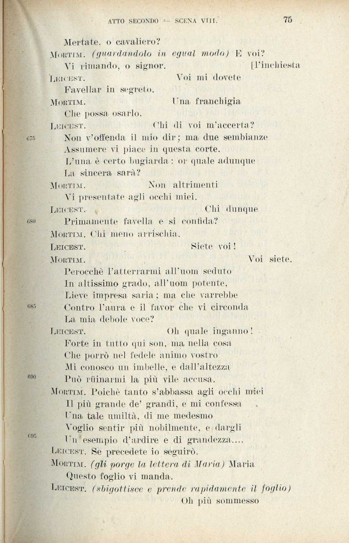 Mortim. Poiché tanto s'abbassa agli occhi miei Il più grande de' grandi, e mi confessa Una tale umiltà, di me medesimi Voglio sentir più nobilmente, e dargli Un esempio, d'ardire e di grandezza....