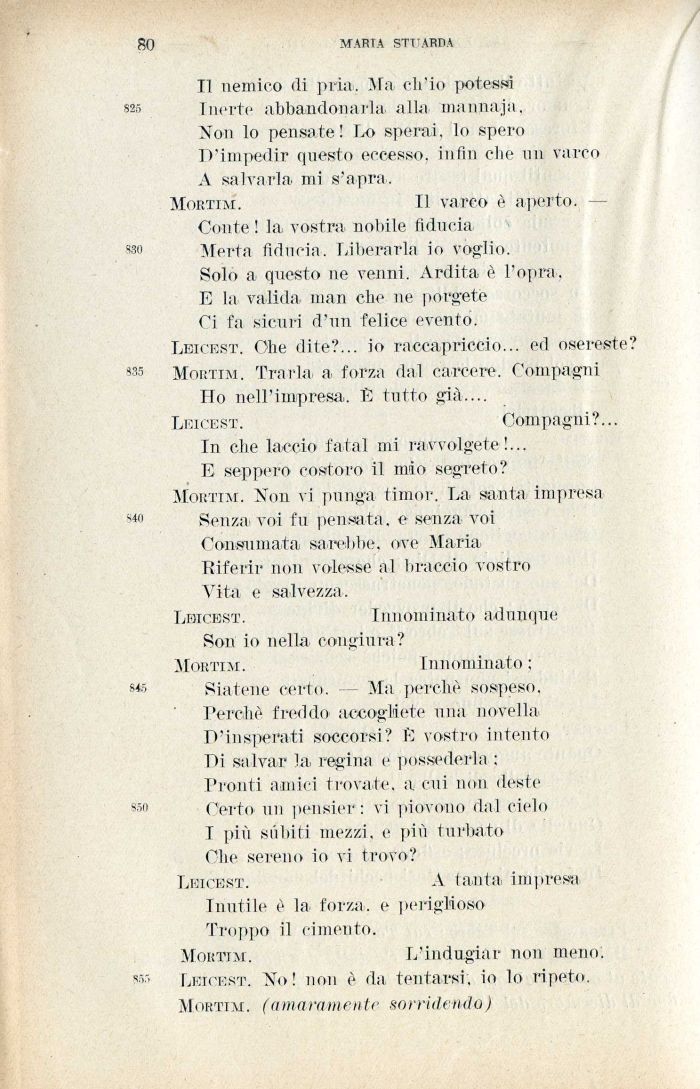 Solo a questo ne venni. Ardita è l'opra, E la valida man che ne porgete Ci fa sicuri d'un felice evento. Leicest. Ohe dite?... io raccapriccio... ed osereste? 485 Mortim. Trarla a forza dal carcere. Compagni Ho nell'impresa. È tutto già.... Leicest. Compagni?...