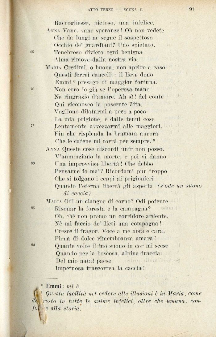 Ne ringrazio d'amore. Ah sì! del conte Qui riconosco la possente aita. Vogliono dilatarmi a, poco a poco La, mia prigione, e dalle tenni cose 75 Lentamente avvezzarmi alle maggiori.
