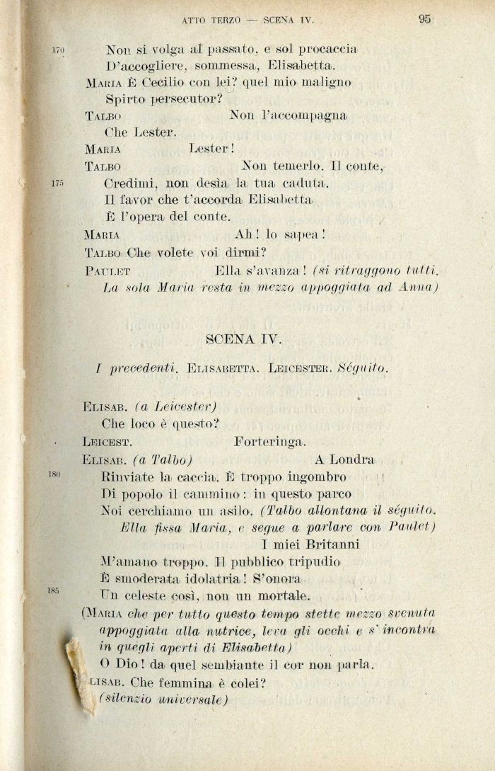 (Maria che per tutto questo tempo stette mezzo svenuta appoggiata alla motrice, leva gli occhi e s'incontra in quegli aperti di Elisabetta ) O Dio! da quel sembiante il cor non parla. lisab. Che femmina è colei? (silenzio universale)