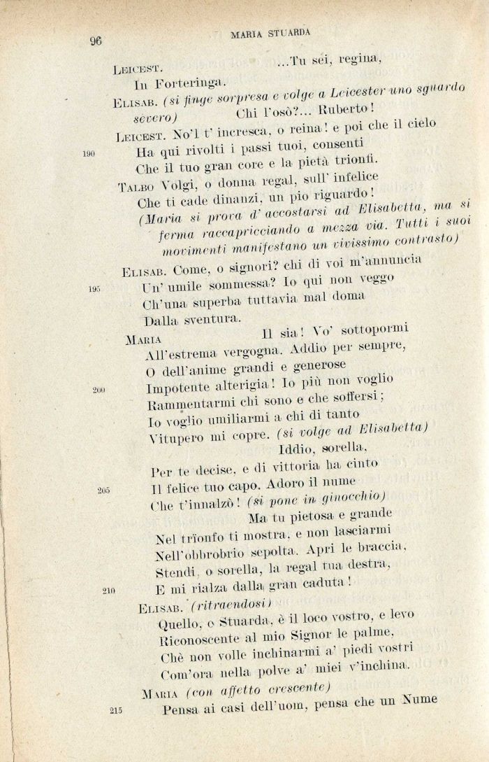 Leicest. Xo'l t'ineresca, o reina ! e poi clie il cielo Ha qui rivolti i passi tuoi, consenti Clic il tuo gran core e la pietà trionfi. Talbo Volgi, o donna regai, soli' infelice Glie ti cade dinanzi, un pio riguardo ! (Maria si prora d.' accostarsi ad Elisabetta, ma si ferina raccapricciando a mezza via. Tutti i suoi movimenti manifestano un vivissimo contrasto) Elisab. Come, o signori? chi di voi m'annuncia