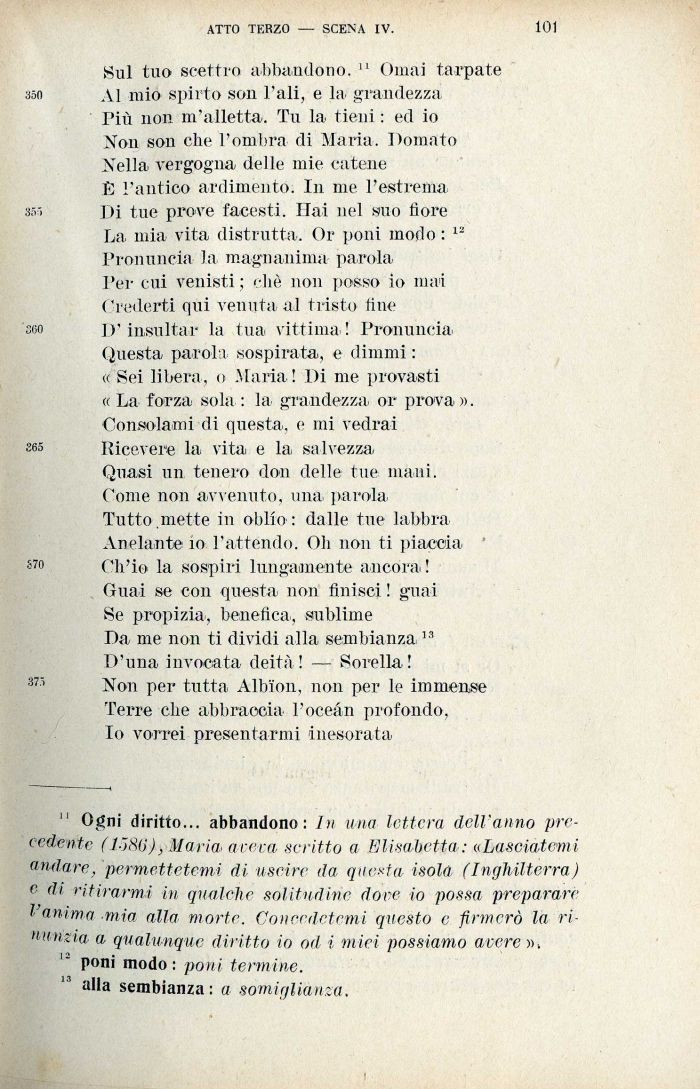 ' Ogni diritto... abbandono: In una lettera dell'anno precedente (1086)) Maria aveva .scritto a Elisabetta: (.(Lasciatemi andare, 'permettetemi di uscire da questa isola (Inghilterra) e di ritirarmi in qualche solitudine dove io possa preparare l'anima ¦mia alla morte. Concedetemi questo e firmerò la rinunzia a qualunque diritto io od i miei possiamo avere », poni modo: poni termine. alla sembianza: a somiglianza.
