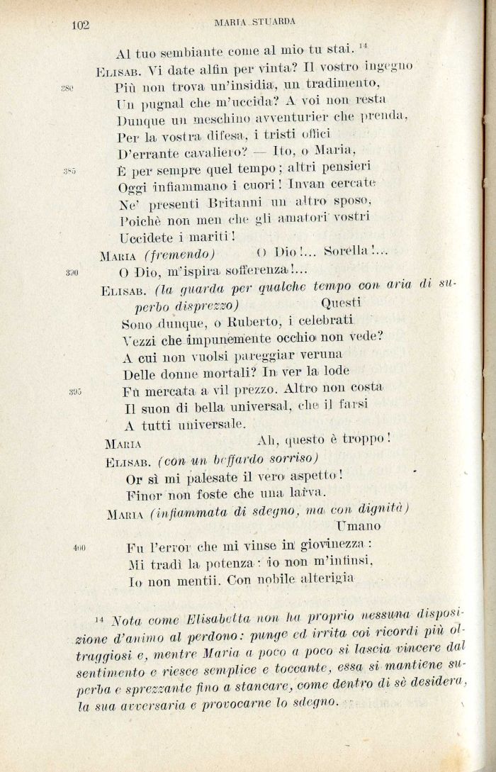 14 Nota come Elisabetta non ha proprio nessuna disposizione d'animo al perdono: punge ed irrita coi ricordi più oltraggiosi e, mentre Maria a poco a poco si lascia vincere dal sentimento e riesce semplice e toccante, essa si mantiene superba, e sprezzante fino a stancare, come dentro di sè desidera. la sua, avversaria e provocarne lo sdegno.