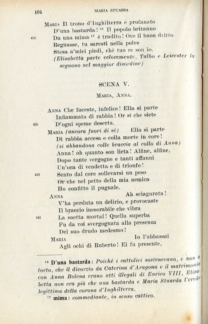 Maria II trono d'Inghilterra è profanato D'una bastarda! 16 II popolo britanno Da una mima 17 è tradito ! Ove il buon di itto Regnasse, tu saresti nella polve Stesa a'miei piedi, che tuo re son io. (Elisabetta parte velocemente, Talbo e Leicester la seguono nel maggior disordine)
