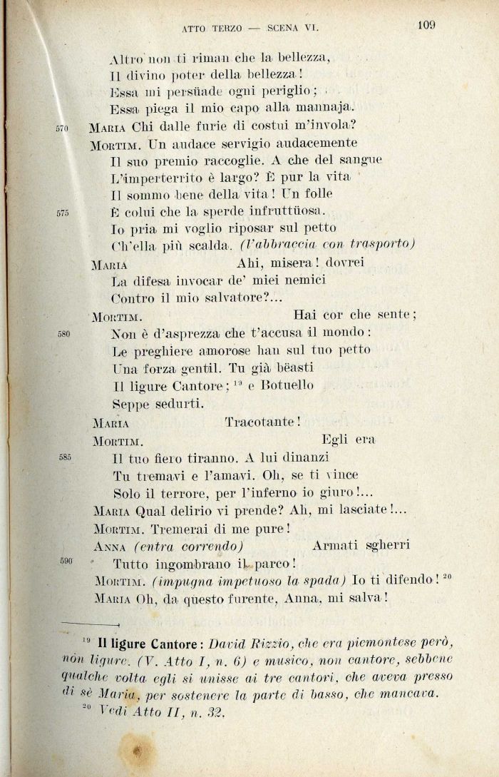 Il ligure Cantore : David Rizzio, che era piemontese però, non ligure. (V. Atto I, n. 6) e musico, non cantore, sebbene gualche volta egli si unisse ai tre cantori, che aveva presso 'H sè Maria, per sostenere la parte di basso, clic mancava. 20 Vedi Atto II, n. 32,