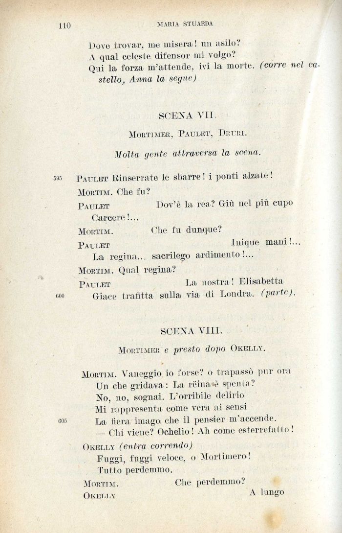 Mortim. Vaneggio, io forse? o trapassò pur ora Un che gridava : La réina^è spenta? No, no, sognai. L'orribile delirio Mi rappresenta come vera ai sensi La fiera imago che il pensier m'accende. — Chi viene? Ochelio ! Ah come esterrefatto ! Okelly (entra correndo)