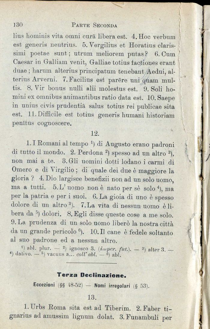 1.1 Romani al tempo J) di Augusto erano padroni \ di tutto il mondo. 2. Perdona 2) spesso ad un altro 3), non mai a te. 3. Gli uomini dotti lodano i carmi di Omero e di Virgilio ; di quale dei due è maggiore la gloria ? 4. Dio largisce benefizii non ad un solo uomo, ma a tutti. 5. L' uomo non è nato per sè solo 4), ma per la patria e per i suoi. 6. La gioia di uno è spesso dolore di un altro3). 7. La vita di nessun uomo è libera da 5) dolori. 8.Egli disse queste cose a me solo. 9. La prudenza di un solo uomo liberò la nostra città da un grande pericolo 6). 10.11 cane è fedele soltanto al suo padrone ed a nessun altro.