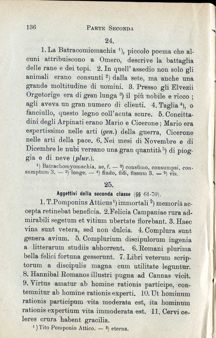 l.La Batracomiomachia 4), piccolo poema che alcuni attribuiscono a Omero, descrive la battaglia delle rane e dei topi. 2. In quell' assedio non solo gli animali erano consunti 2) dalla sete, ma anche una grande moltitudine di uomini. 3. Presso gli Elvezii Orgetorige era di gran lunga 3) il più nobile e ricco ; agli aveva un gran numero di clienti. 4. Taglia4), o fanciullo, questo legno coli'acuta scure. 5. Concittadini degli Arpinati erano Mario e Cicerone ; Mario era espertissimo nelle arti (gen.) della guerra, Cicerone nelle arti della pace. 6. Nei mesi di Novembre e di Dicembre le nubi versano una gran quantità5) di pioggia e di neve (plur.).