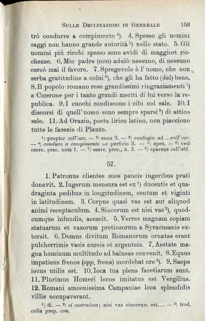 trò condurre a compimento 4). 4. Spesso gli uomini saggi non hanno grande autorità5) nello stato. 5. Gli uomini più ricchi spesso sono avidi di maggiori ricchezze. 6. Mio padre (non) adulò nessuno, di nessuno cercò mai il favore. 7. Spregevole è 1' uomo, che non serba gratitudine a colui6), che gli ha fatto (del) bene. 8.11 popolo romano rese grandissimi ringraziamenti7) a Cicerone per i tanto grandi meriti di lui verso la re-publica. 9.1 cuochi condiscono i cibi col sale. 10.1 discorsi di quell'uomo sono sempre sparsi8) di attico sale. 11. Ad Orazio, poeta lirico latino, non piacciono tutte le facezie di Plauto.