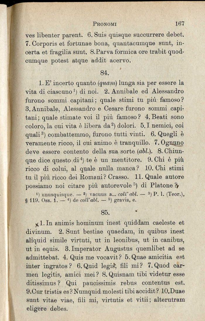 l.E' incerto quanto (quam) lunga sia per essere la vita di ciascuno*) di noi. 2. Annibale ed Alessandro furono sommi capitani; quale stimi tu più famoso? 3. Annibale, Alessandro e Cesare furono sommi capitani ; quale stimate voi il più famoso ? 4. Beati sono coloro, la cui vita è libera da2) dolori. 5.1 nemici, coi quali3) combattemmo, furono tutti vinti. 6. Quegli è veramente ricco, il cui animo è tranquillo. 7. Ognjjno deve essere contento della sua sorte (abl.). 8. Chiunque dice questo di4) te è un mentitore. 9. Chi è più ricco di colui, al quale nulla manca ? 10. Chi stimi tu il più ricco dei Romani? Crasso. 11. Quale autore possiamo noi citare più autorevole 3) di Platone fy