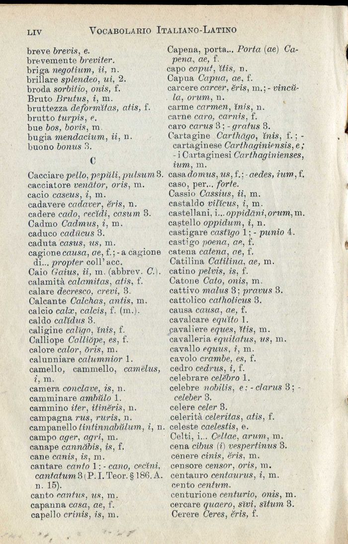 di... propfer coli' acc. Caio Gaius, ii, m. (abbrev. C. I. calamità calamitas, atis, f. calare decresco, crevi, 3. Calcante Calchas, antis, m. calcio calx, calcis, f. (m.). caldo calidus 3. caligine caligo, inis, f. Calliope Calliope, es, f. calore calor, Oris, m. calunniare calumnior 1. camello, cammello, camèlus, i, m.
