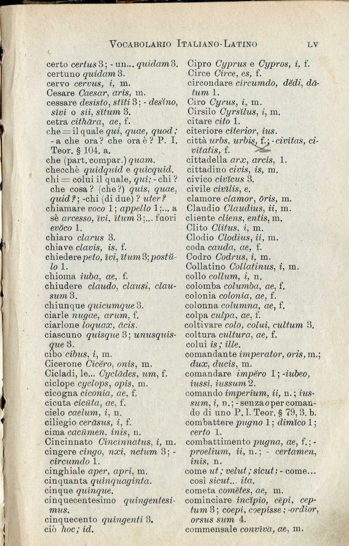 certo certus 3 ; - un... quidam3. certuno quidam 3. cervo cervus, i, m. Cesare Caesar, aris, m. cessare desisto, stiti 3: - desino, swi o sii, sìtum 3. cetra cithàra, ae, f. che = ilquale qui, quae, quod; - a clie ora ? che ora è ? P. I. Teor. § 104. a. che (part. compar.) quam. checche quidquid e quicquid. chi = colui il quale, qui; - chi ? che cosa? (che?) quis, quae, quid ? ; -chi (di due) ? uter ? chiamare voco 1 ; appello 1 ;... a sè arcesso, ivi, itum 3:... fuori evoco 1.