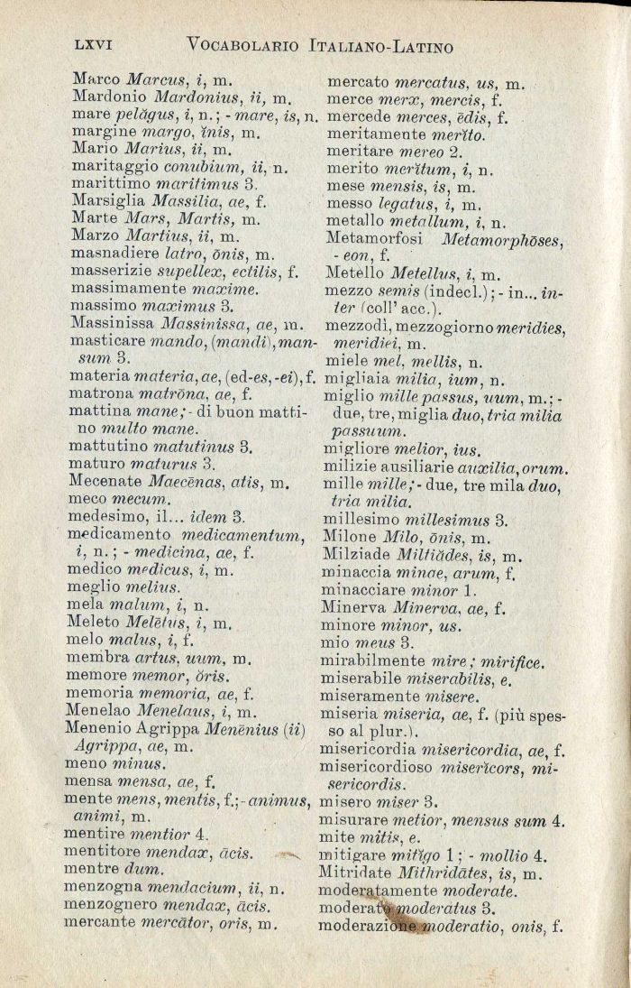 Marco Marcus, i, m. Mardonio Mardonìus, ii, m. mare pelàgus, i, n. ; - mare, is, n. margine margo, inis, m. Mario Marius, ii, m. maritaggio conubium, ii, n. marittimo maritimus 3. Marsiglia Massilia, ae, f. Marte Mars, Martis, m. Marzo Martius, ii, m. masnadiere latra, Onis, m. masserizie supellex, ectìlis, f. massimamente maxime. massimo maximus 3. Massinissa Massinissa, ae, m. masticare mando, (mandi),man-sum 3.