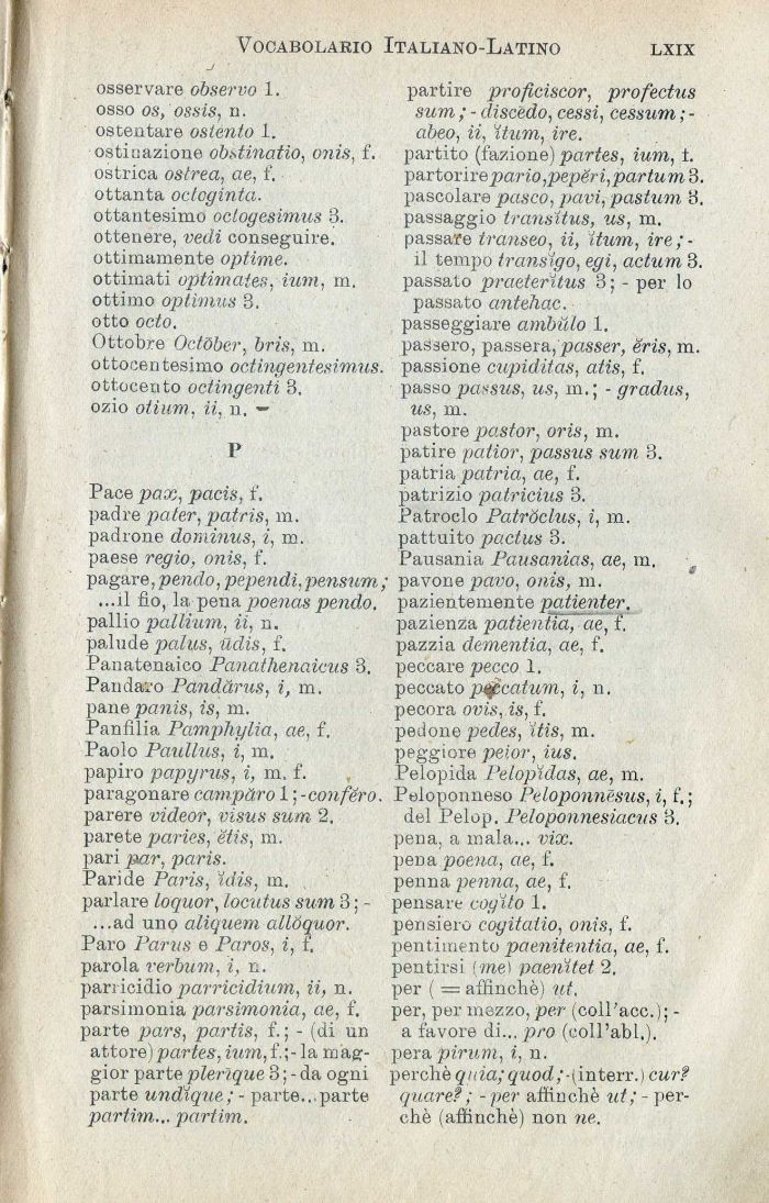 ...il fio, la pena poenas pendo. pallio pallium, ii, n. palude palus, udis, f. Panatenaico Panathenaicus 3. Pandai'o IJandar us, i, m. pane panis, is, m. Panfilia Pamphylia, ae, f. Paolo Paullus, i, m. papiro papyrus, i, m. f. paragonare campàro 1 ; - confèro. parere videor, visus sum 2. parete paries, etis, m. pari par, paris. Paride Paris, ìdis, m. parlare loquor, locutus sum 3 ; -