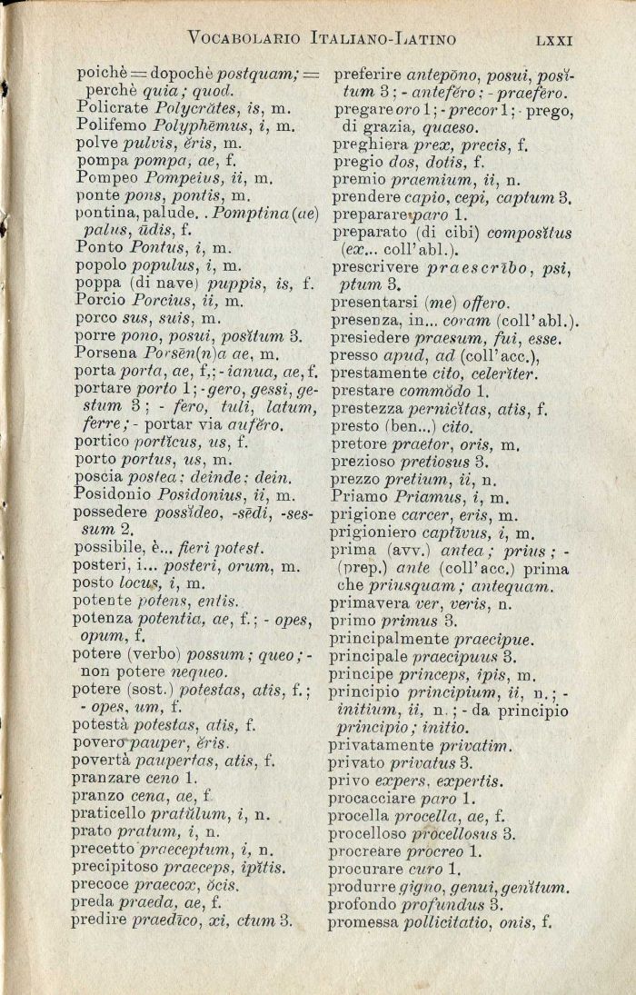 perchè quia ; quod. Policrate Polycrùtes, is, m. Polifemo Polyphemus, i, m. polve pulvis, Sris, m. pompa pompa, ae, f. Pompeo Pompeius, ii, m, ponte pons, pontis, m. pontina, palude. . Pomptìna(ae) pains, udis, f. Ponto Pontus, i, m. popolo populus, i, m. poppa (di nave) puppis, is, f. Porcio Porcius, ii, m. porco sus, suis, m. porre pono, posui, posìtum 3. Porsena Porsen(n)a ae, m. porta porto, ae, i,\-ianua, ae,f. portare porto 1 ; - gero, gessi, ge-stum 3 : - fero, fìlli, latum, ferre;- portar via auf'Sro. portico porticus, us, f. porto portus, us, m. poscia postea ; deinde ; dein. Posidonio Posidonius, ii, m. possedere possideo, -sèdi, -sessum 2.