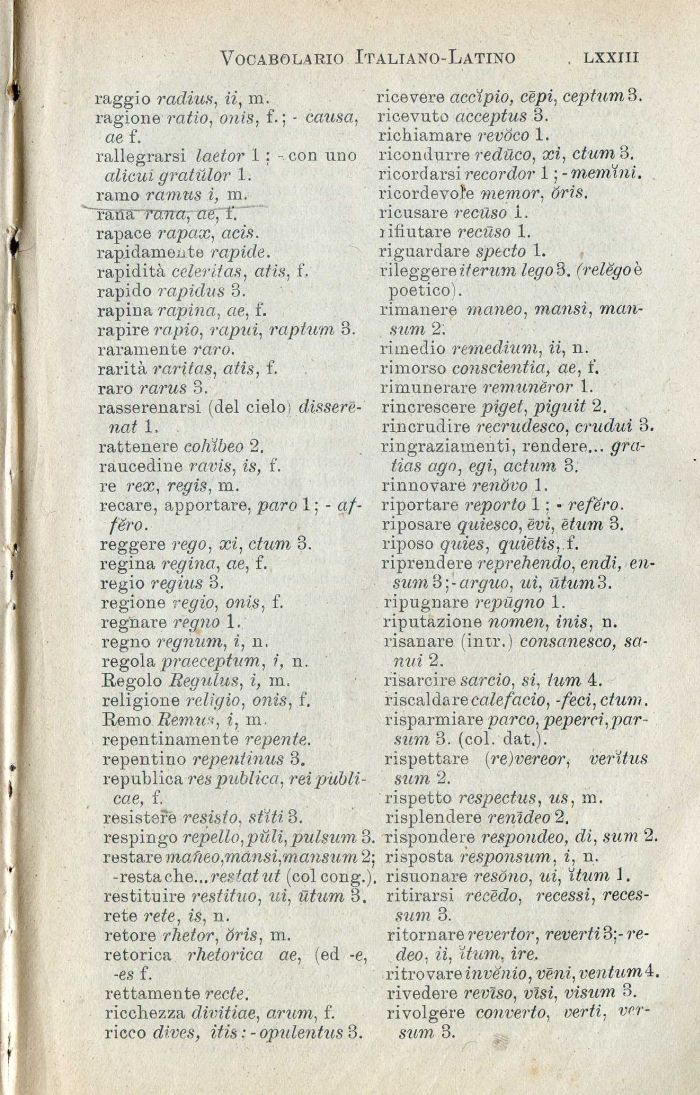 ricevere accipio, cepi, ceptumS. ricevuto acceptus 3. richiamare revoco I. ricondurre reduco, xi, ctuni 3. ricordarsi recordor 1 ; -memìni. ricordevole memor, Óris. ricusare reciìso i. lifiutare recìiso 1. riguardare spedo 1. rileggereiterum legoS. (relegoè poetico), rimanere maneo, mansi, man-
