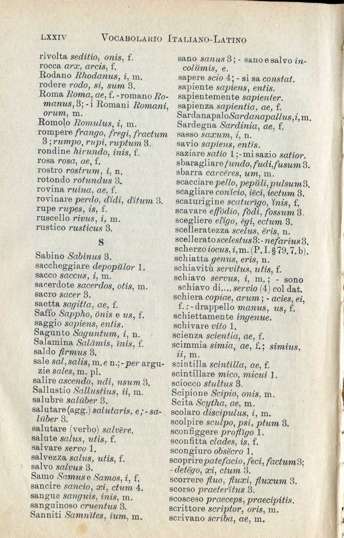 sapere scio 4; - si sa constai. sapiente sapiens, entis. sapientemente sapienter. sapienza sapientia, ae, f. Sardanapal o Sardanapallus,i, m. Sardegna Sardinia, ae, f. sasso saxum, i, n. savio sapiens, entis. saziare satio 1 ;-mi sazio satior. sbaragliare fundo, fudi,fusum 3. sbarra carcéres, um, m. scacciare pello,pepùli,pulsum3. scagliare conicio, ieci, iectum 3. scaturigine scciturigo, inis, f, scavare effódio, fódi, fossum 3. scegliere elìgo, ègi, ecium 3. scelleratezza scelus, Sris, n. scellerato scelestus 3: - nefarius 3. scherzo ioc.us, i, m. (P. I. § 79.7. b). schiatta genus, eris, n. schiavitù servitus, utis, f. schiavo servus, i, m. ; - sono schiavo di.... Servio (4) col dat. schiera copiae, arum ; - acies, ei, f..--drappello manus, us, f. schiettamente ingenue. schivare Vito 1. scienza scientia, ae, f. scimmia simia, ae, f. ; simius, ii, m.