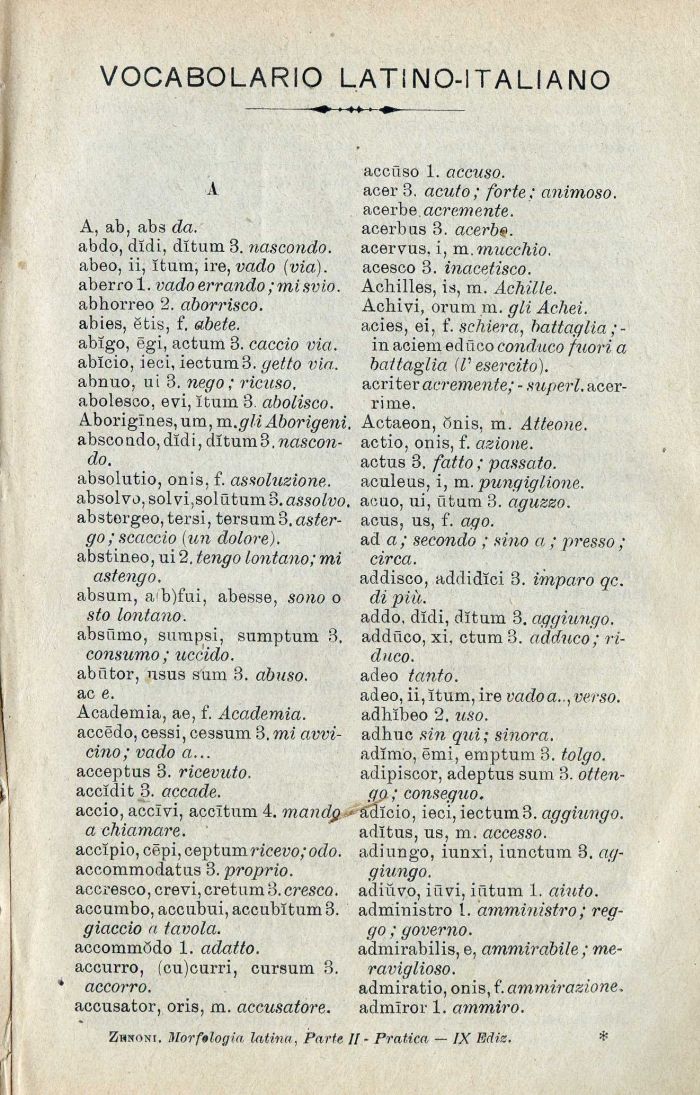 abdo, dldi, dltum 3. nascondo. abeo, ii, Itum, ire, vado (via). aberro 1. vado errando ; mi svio. abhorreo 2. aborrisco. abies, étis, f. abete. abigo, egi, actum 3. caccio via. ablcio, ieci, iectum3. getto via.. abnuo, ni 3. nego; ricuso. abolesco, evi, Itum 3. abolisco. Aborigì nes, um,m.jfi Aborigeni. absoo ndo, dldi, dltum 3. nascondo.