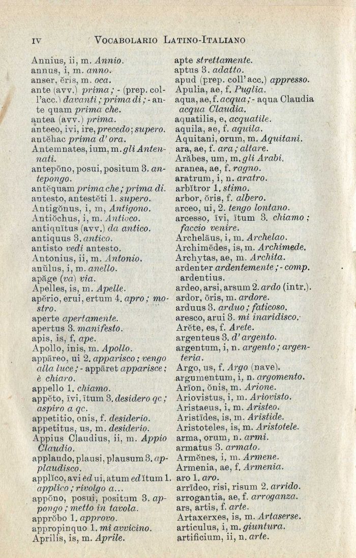 antepono, posui, positum 3. antepongo. antequamprima che; prima di. a.n testo, antestèti 1. supero. Antigònus, i, m, Antigono. Antifichus, i, m. Antioco. antiqultus (avv.) da antico. antiquus 3. antico. antisto vedi an testo. Antonius, ii, m. Antonio. anulus, i, m. anello. apètge (va) via. Apelles, is, m. Apelle. apério, erui, ertum 4. apro ; mostro.