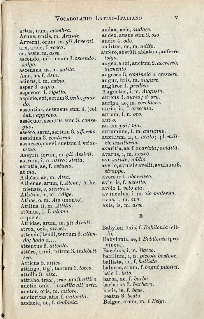artus, uum, membra. Aruns, untis, m. Arunte. Arverni, orum, m. gli Arverni. arx, arcis, f, rocca. as, assis, m. asse. ascendo,-ndi,-nsum 3. ascendo ; salgo. ascensus, us, m. salita. Asia, ae, f. Asia. asinus, i, m. asino. asper 3. aspro. aspernor 1. rigetto. asplcio, exi, ectum 3. vedo; guardo.
