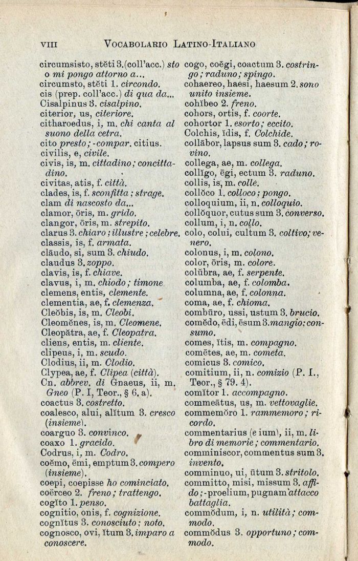 Gneo (P.I, Teor., § 6. a), coactus 3. costretto. coalesco, alui, alltum 3. cresco (insieme). coarguo 3. convinco. « coaxo 1. gracido. Codrus, i, m. Codro. coSmo, emi, emptum3.compero