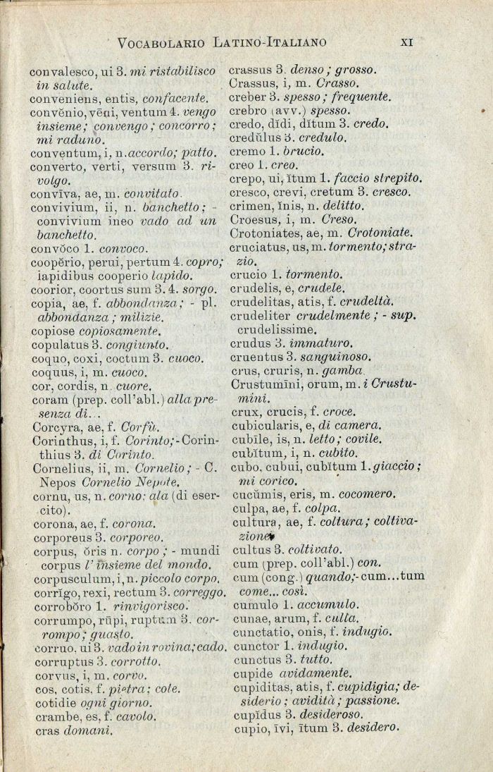 iapidibus cooperio lapido. coorior, coortus sum 3.4. sorgo. copia, ae, f'. abbondanza; - pi. abbondanza ; milizie. copiose copiosamente. copulatus 3. congiunto. coquo, coxi, coctum 3. cuoco. coquus, i, m. cuoco. cor, cordis, n. cuore. coram (prep. coll'abl.) allapre-senza di. . Corcyra, ae, f. Corfù. Oorinthus, i, f. Corinto;-Corin-thius 3. di Corinto. Cornelius, ii, m. Cornelio ; - C. Nepos Cornelio Ne/tute. cornu, us, n. corno: ala (di esercito).