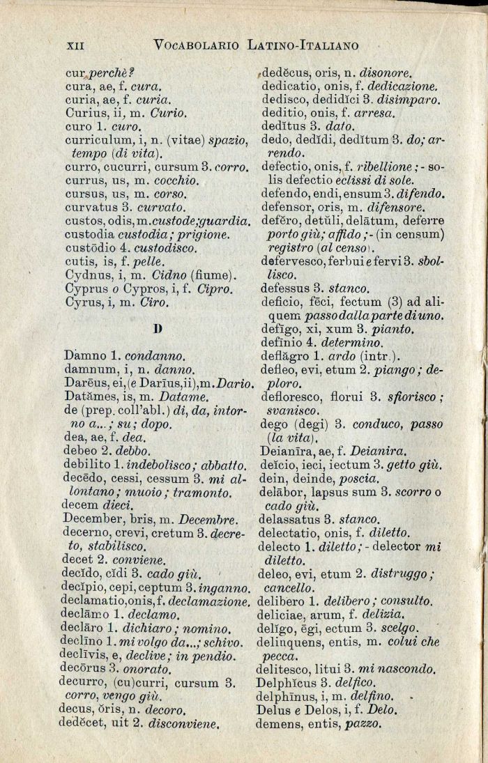 Damno 1. condanno. damnum, i, n. danno. Daréus, ei,(e Darius,ii),m.Z)am, Dat&mes, is, m. Datarne. de (prep. coll'abl.) di, da, intorno a...; su; dopo. dea, ae, f. dea. debeo 2. debbo.