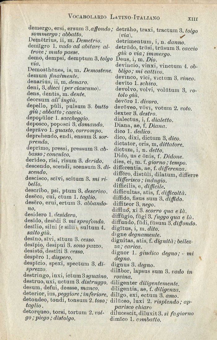detrimentum, i, n. danno. detrùdo, trusi, trusum 3. caccio giù o via; immergo. Deus, i, m. Dio. devincio, vinxi, vinctum 4. obbligo; mi cattivo. devmco, vici, victum 3. vinco. devlto 1. schivo. devolvo, volvi, volutimi 3. rotolo giù. devOro 1. divoro. devóveo, vovi, votum 2. voto. dexter 3. destro. dialectus, i, f. dialetto. Diana, ae, f. Diana. dico 1. dedico. dico, dixi, dictum 3. dico. dictator, oris, m. dittatore. dictum, i, n. detto. Dido, us e onis, f. Didone. dies, ei, m. f. giorno ; tempo. differenza, ae, f. differenza. differo, distilli, dilatum, diff'erre differisco ; indugio. difficilis, e, difficile. difficultas, atis, f. difficoltà. diffido, fisus sum 3. diffido. diffiteor 3. nego. diffhicT, xi 3. scorro qua e là. difiugio, fugi 3. fuggo qua e là. difiùndo, fudi,iusum 3. diffondo. digitus, i, m. dito. digne degnamente. dignitas, atis, f. dignità; bellezza; carica.