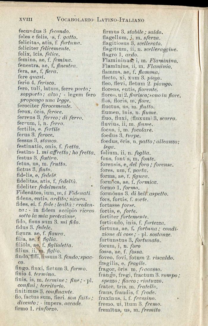 fecundus 3 fecondo. feles e felis, s, f. gatto. felicita*, atis, f. fortuna. feliciter felicemente. felix, icis, felice. femina, ae, f. femina. fenestra. ae, f. finestra. fera, ae, f, fiera. fere quasi. f'erio 4. ferisco. fero, tuli, latitili, ferre porto; sopporto; alzo; - legem fero propongo una l'gge. ferociter ferocemente. ferox, ocis, feroce. ferrens 3. ferreo; di ferro. ferrum, i, n. ferro. fertilis, e. fertile ferus 3. feroce. fessus 3. stanco. festinatio, onis, f. fretta. festino 1. mi affretto; ho fretta. festus 3. festivo. fetus, us, m. frutto. fictus 3. finto. fidflis, e, fedele. fidelitas, atis, f, fedeltà. fldeliter fedelmente. Fidenates, ium, m, i Fidenati. fidens, entis. ardito; sicuro. fides, ei. f. fede ; lealtà : credenza; - in fidem accipio ricevo sotto la mia protezione. fido, fìsus sum 3. mi fido. fidus 3. fedele. figura, ae, f. fiaura. filia, ae, f figlia. fìliòia, ae, f. figlioletta. fìlius. ii. in. figlio. findo,'fldi, fissum 3. fendo; spacco.