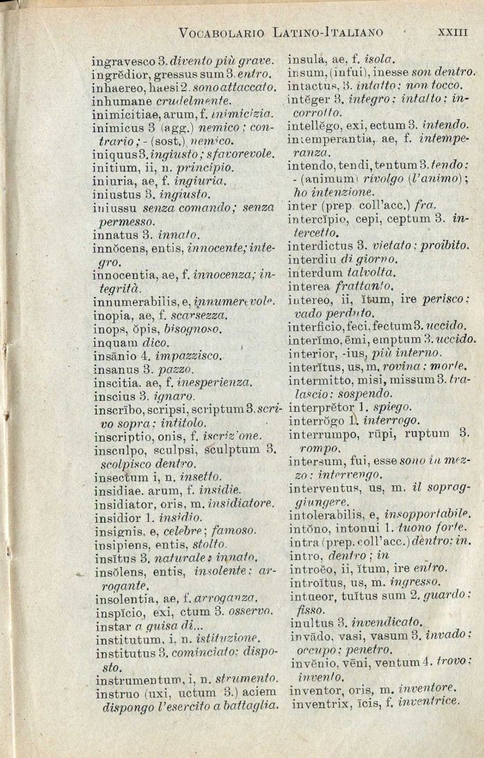 innumerabilis, e, innumerevole. inopia, ae, f. scarsezza. inops, Qpis, bisognoso. inquam dico. insanio 4. impazzisco. insanus 3. pazzo. inscitia. ae, f. inesperienza. inscius 3. ignaro. inscrlbo, scripsi, scriptum 3. scrivo sopra ; intitolo. inscriptio, onis, f. iscrizione. insculpo, sculpsi, sculptum 3. scolpisco dentro. insectum i, n. insetto. insidiae. arum, f. insidie. insidiator, oris, m. insidiatore. insidior 1. insidio. insignis. e, celebre; famoso. insipiens, entis, stolto. insltus 3. naturale; innato. insOlens, entis, insolente; arrogante. insolentia, ae, f. arroganza. insplcio, exi, ctum 3. osservo. instar a guisa di... institutum. i, n. istituzione. institutus 3. comincialo: disposto.