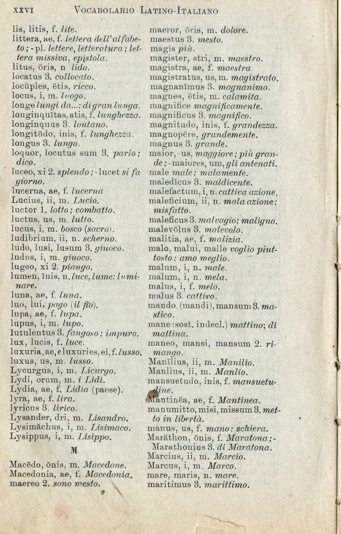 littera, ae, f. Lettera deli'alfabeto ; - pi. lettere, letteratura ; lettera missiva, epistola. litus, Oris, n lido. locatus 3. collocato. locuples, etis, ricco. locus, i, m. luogo. Icmge lungi da...; digran lunga. longinqultas, atis, f. lunghezza. longinquns 3. lontano. longitudo, inis; f. lunghezza. longus 3. lungo. loquor, locutus sum 3. parlo; dico.