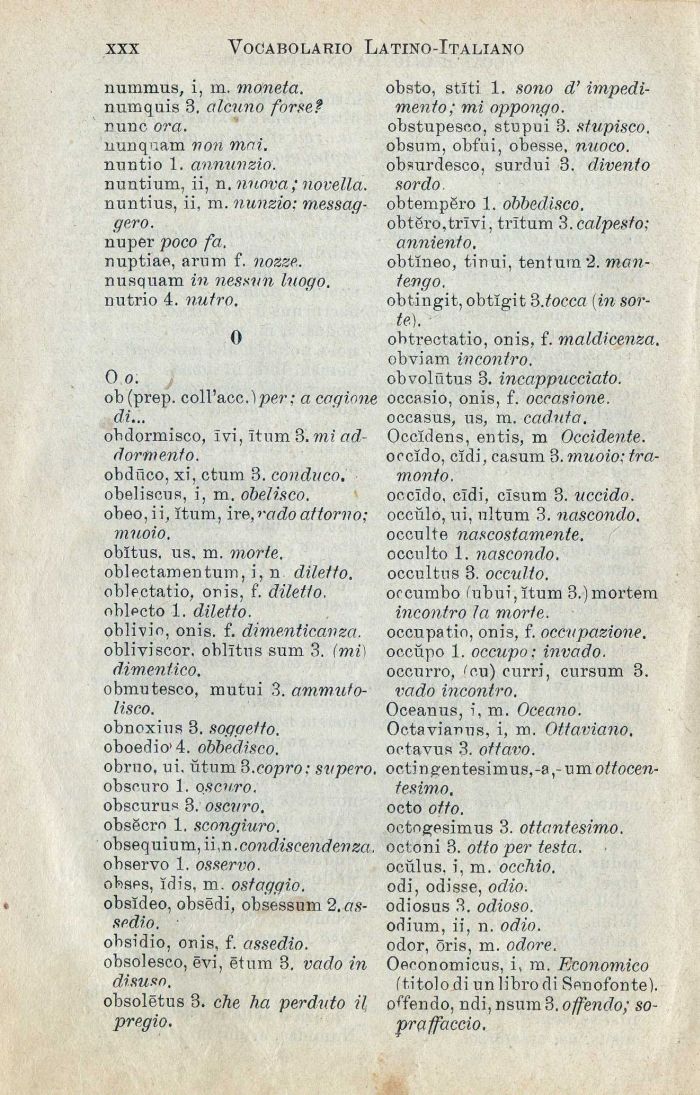 oetngesimus 3. ottantesimo. octoni 8. otto per testa. ocùlus. i, m. occhio. odi, odisse, odio. odiosus 3. odioso. odium, ii, n. odio. odor, oris, m. odore. Oeconomicus, i, m. Economico (titolo di un libro di Senofonte), offendo, ndi, nsum 3. offendo; sopraffaccio.