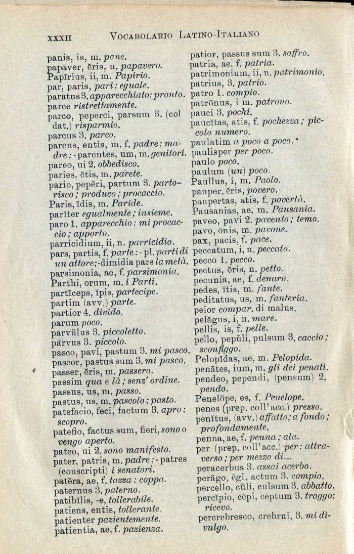 panis, is, m. pane. papàver, èris, n. papavero. Papirius, ii, m. Papìrio. par, paris, pari; eguale. paratusS. apparecchiato; pronto. parce ristrettamente. parco, peperei, parsum 3. (col dat.) risparmio. parcus 3, parco. parens, entis, m. f. padre: madre : - parentes, um, m.genitori. pareo, ui 2. obbedisco. paries, étis, m. parete. pario, pepéri, partum 3. partorisco ; produco ; procaccio. Paris, Idis, m. Paride. pariter egualmente ; insieme. paro 1. apparecchio : mi procaccio; apporto. parricidium, ii, n. parricidio. pars, partis, f. parte ;-pl. parti dì un attore;-dimidia pars lametà. parsimonia, ae, f. parsimonia. Parthi, orum, m. i Parti. partlceps, Ipis, partecipe. partim (avv.) parte. partior 4. divido. parum poco. parviìl us 3. piccoletto. pàrvus 3. piccolo. pasco, pavi, pastum 3. mi pasco. pascor, pastus sum 3. mi pasco. passer, Sris, m. passero. passim qua e là ; senz' ordine. passus, us, m. passo. pastus, us, m. pascolo ; pasto. patefacio, feci,' factum 3. apro; scopro.