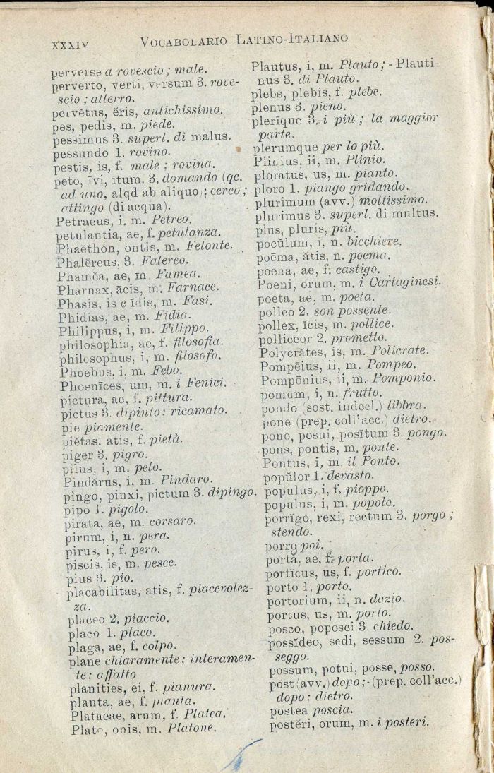 perveise a rovescio ; male. perverto, verti, vt-rsum 3. voteselo ; atterro. peivétus, éris, antichissimo. pes, pedis, m. piede. pessimus 3. superi, di malus. pessundo 1. rovino. pestis, is, f'. male ; rovina. peto, Ivi, Itum. 3. domando (qc. ad uno, alqd ab aliquo : cerco ; attingo (di acqua). Petraeus, i. m. Petreo. petulantia, ae, i. petulanza. Phaéthon, ontis, m. Fetonte. Phalereus, 3. Falereo. Phamea, ae, in. Fumea. Pharnax, acis, m. Fornace. Phasis, is e Idis, m. Fasi. Pbidi.as, ae, m. Fidia. Philippus, i, m. Filippo. philosophia, ae, f. filosofia. philosophus, i, m. filosofo. Plioebus, i, m. Febo. Plioenices, um, m. i Fenici. pictura, ae, f. pittura. pictus 3. dipinto; ricamato. pie piamente. piétas, atis, f. pietà. piger 3. pigro. pilus, i, m. peto. Pind&rus, i, m. Pindaro. pingo, pinxi, pictum 3. dipingo. pipo i. pigolo. pirata, ae, m. corsaro. pirum, i, n. pera. pirus, i, f. pero. piscis, is, m. pesce. pius 3. pio,