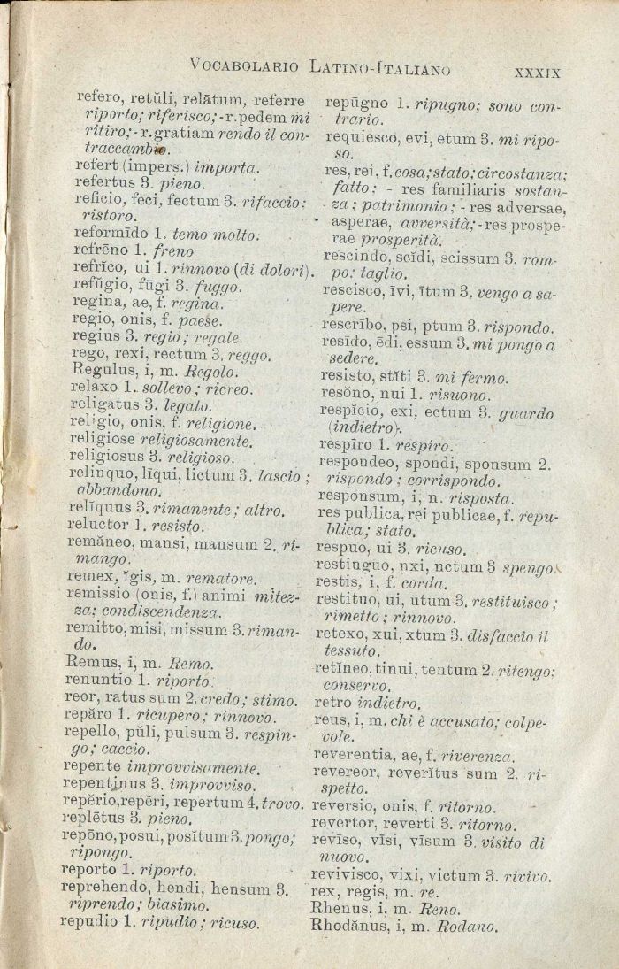 refrlco, ui 1. rinnovo {di dolori). refugio, ftigi 3. fuggo. regina, ae, f. regina. regio, onis, f. paese. regius 3. regio ; regale. rego. rexi, rectum 3. reggo. Regulus, i, m. Regolo. relaxo 1.. sollevo ; ricreo. religatus 3. legato. religio, onis, f. religione. religiose religiosamente. religiosus 3. religioso. relinquo, lìqui, lictum 3. lascio ; abbandono. rellquus 3. rimanente ; altro. reluetor 1. resisto. remàneo, mansi, mansum 2, rimango. remex, Igis, m. rematore. remissio (onis, f.) animi mitezza; condiscendenza. remitto, misi, missum 3. rimando.