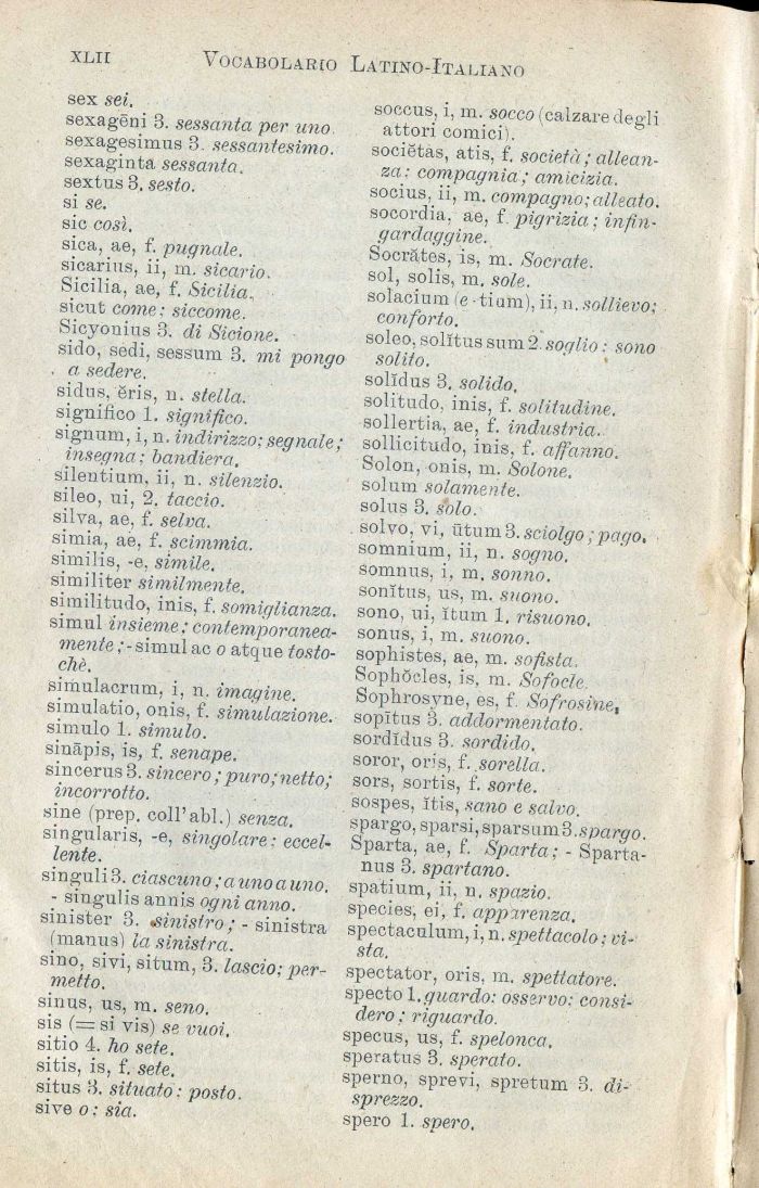 solvo, vi, utum3. sciolgo ; pago, somnium, ii, n. sogno. somnus, i, m. sonno. sonitus, us, m, suono. sono, ui, itum 1, risuono. sonus, i, m. suono. sophistes, ae, m. sofista. SophSeles, is, m. Sofocle. Sophrosyne, es, f. Sofrosine, sopitus 3. addormentato. sordldus 3. sordido. soror, oris, f. sorella.. sors, sortis, f. sorte. sospes, Iti-s, sano e salvo. spargo, sparsi, sparsum3. spargo. Sparta, ae, f. Sparta; - Sparta-nus 3. spartano. spatium, ii, n. spazio. species, ei, f. apparenza. spectaculum, i,n. spettacolo; vista.