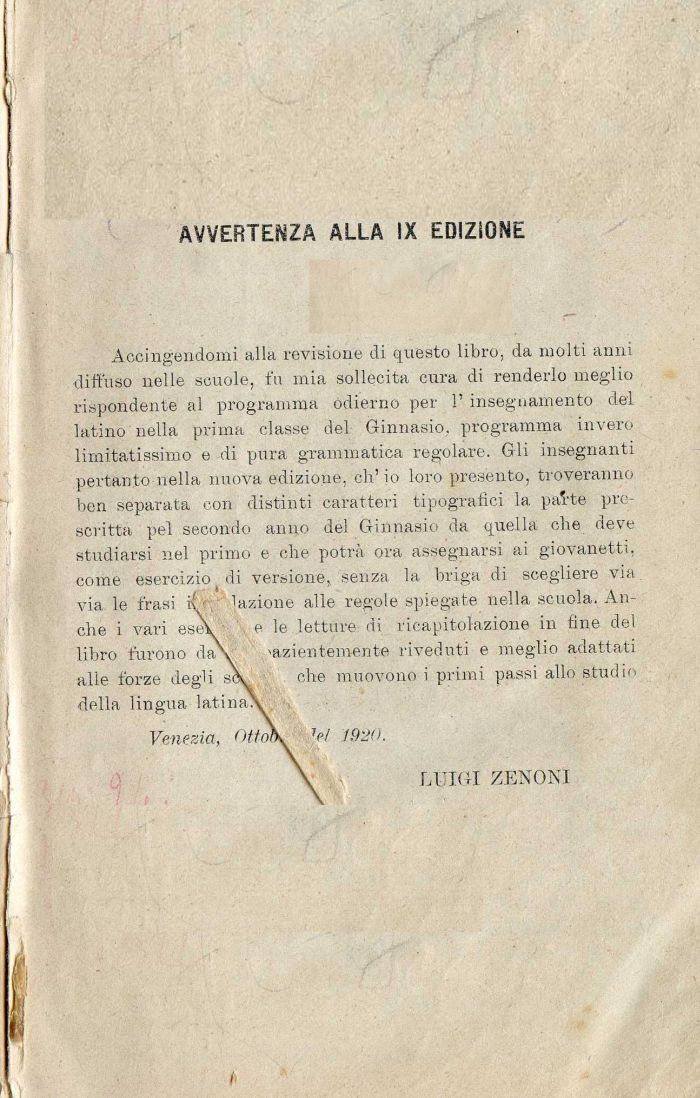 Accingendomi alla revisione di questo libro, da molti anni diffuso nelle scuole, fa mia sollecita cura di renderlo meglio rispondente al programma odierno per l'insegnamento del latino nella prima classe del Ginnasio, programma invero limitatissimo e di pura grammatica regolare. Gli insegnanti pertanto nella nuova edizione, eli' io loro presento, troveranno ben separata con distinti caratteri tipografici la pai-te prescritta pel secondo anno del Ginnasio da quella che deve studiarsi nel primo e che potrà ora assegnarsi ai giovanetti, come esercizio ( di versione, senza la briga di scegliere via via le frasi i{ 1 azione alle regole spiegate nella scuola. Anche i vari eseV e le letture di ricapitolazione in fine del libro furono da\ >azientèmente riveduti e meglio adattati alle forze degli sey che muovono i primi passi allo studio della lingua lat.inaX