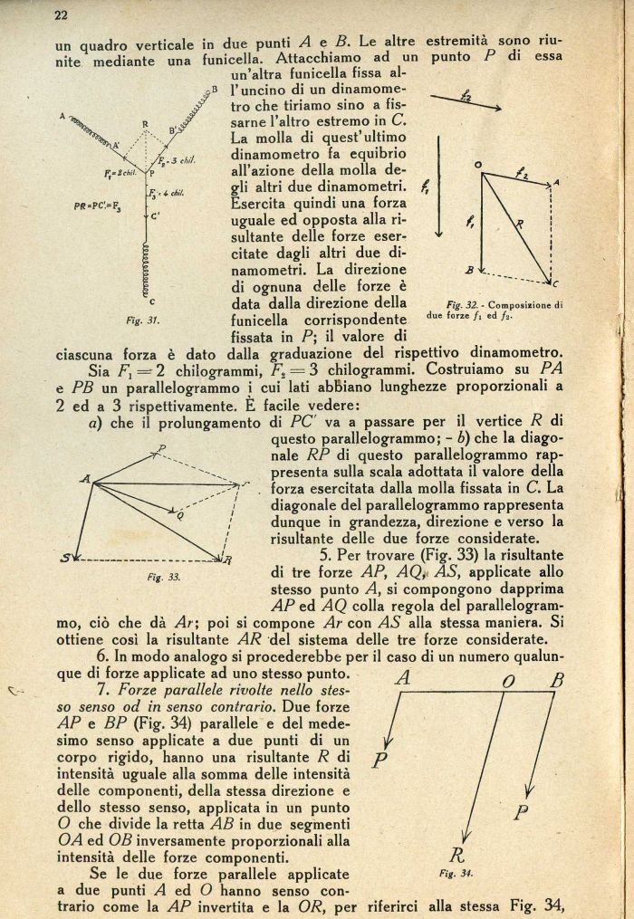 7. Forze parallele rivolte nello stesso senso od in senso contrario. Due forze AP e BP (Fig. 34) parallele e del medesimo senso applicate a due punti di un corpo rigido, hanno una risultante R di intensità uguale alla somma delle intensità delle componenti, della stessa direzione e dello stesso senso, applicata in un punto O che divide la retta AB in due segmenti OA ed OB inversamente proporzionali alla intensità delle forze componenti.