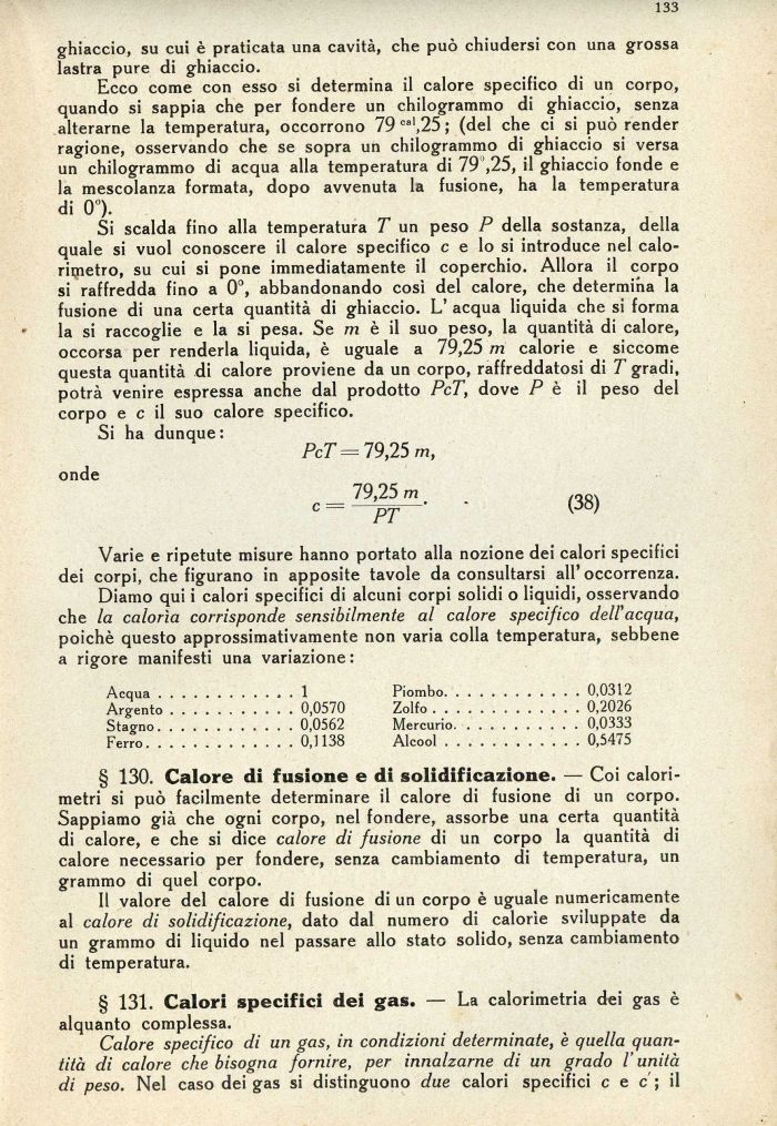 Diamo qui i calori specifici di alcuni corpi solidi o liquidi, osservando che la calorìa corrisponde sensibilmente al calore specifico dell'acqua, poiché questo approssimativamente non varia colla temperatura, sebbene a rigore manifesti una variazione :