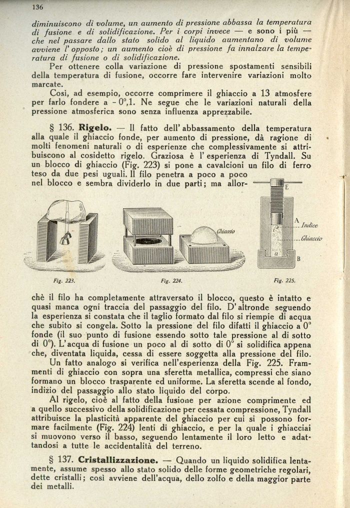 § 136. Rigelo. — Il fatto dell' abbassamento della temperatura alla quale il ghiaccio fonde, per aumento di pressione, dà ragione di molti fenomeni naturali o di esperienze che complessivamente si attribuiscono al cosidetto rigelo. Graziosa è 1' esperienza di Tyndall. Su un blocco di ghiaccio (Fig. 223) si pone a cavalcioni un filo di ferro teso da due pesi uguali. Il filo penetra a poco a poco nel blocco e sembra dividerlo in due parti ; ma allor-