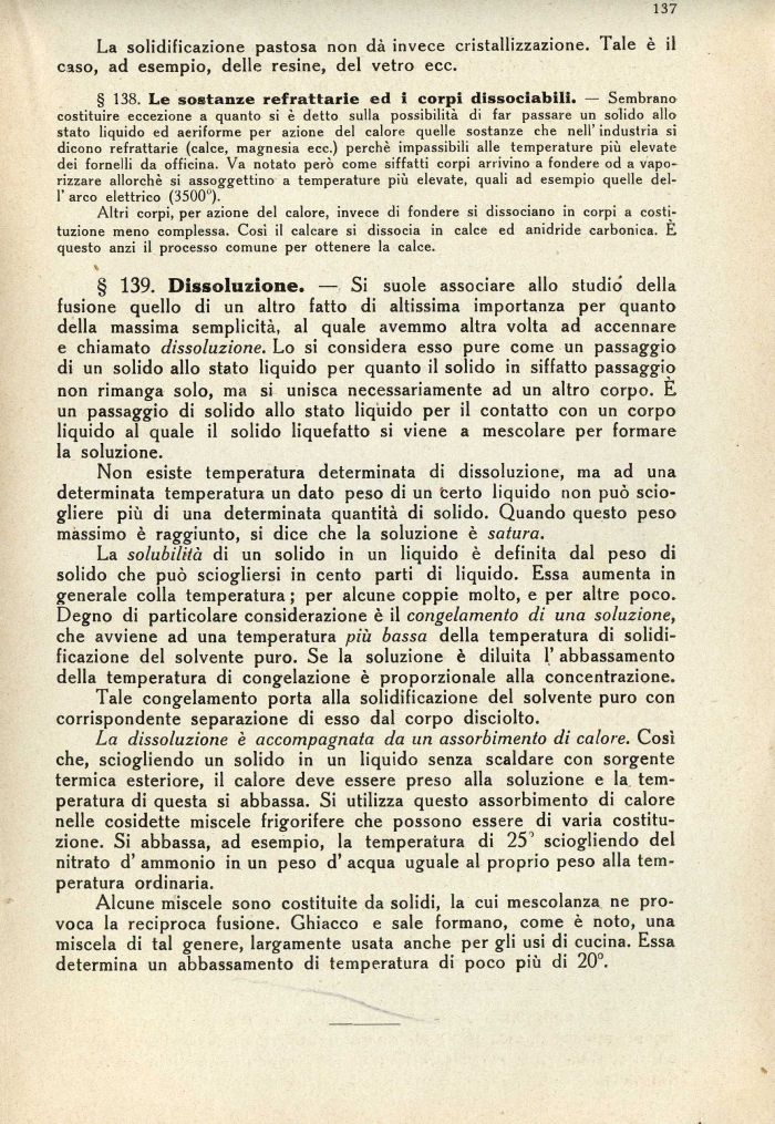 § 139. Dissoluzione. — Si suole associare allo studio della fusione quello di un altro fatto di altissima importanza per quanto della massima semplicità, al quale avemmo altra volta ad accennare e chiamato dissoluzione. Lo si considera esso pure come un passaggio di un solido allo stato liquido per quanto il solido in siffatto passaggio non rimanga solo, ma si unisca necessariamente ad un altro corpo. E un passaggio di solido allo stato liquido per il contatto con un corpo liquido al quale il solido liquefatto si viene a mescolare per formare la soluzione.