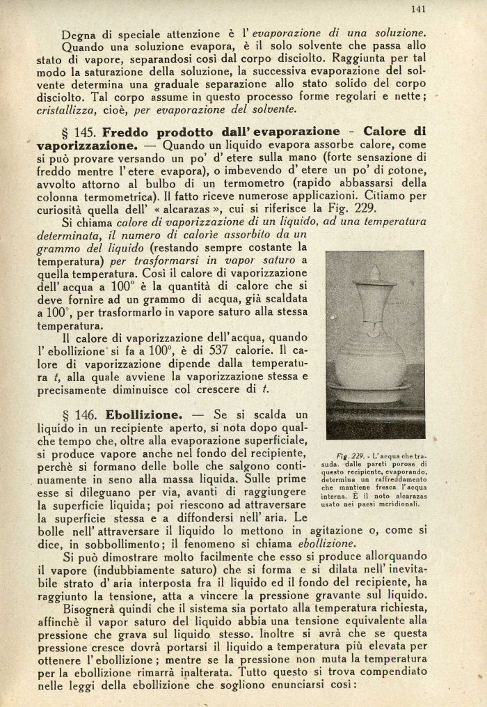 § 145. Freddo prodotto dall' evaporazione - Calore di vaporizzazione. — Quando un liquido evapora assorbe calore, come si può provare versando un po' d' etere sulla mano (forte sensazione di freddo mentre l'etere evapora), o imbevendo d'etere un po' di cotone, avvolto attorno al bulbo di un termometro (rapido abbassarsi della colonna termometrica). Il fatto riceve numerose applicazioni. Citiamo per curiosità quella dell' « alcarazas », cui si riferisce la Fig. 229.