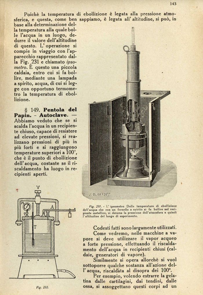 Poiché la temperatura di ebollizione è legata alla pressione atmosferica, e questa, come ben sappiamo, è legata all' altitudine, si può, in base alla determinazione della temperatura alla quale bolle l'acqua in un luogo, dedurre il valore dell'altitudine di questo. L'operazione si compie in viaggio con l'apparecchio rappresentato dalla Fig. ,231 e chiamato ipsometro. E questo una piccola caldaia, entro cui si fa bollire, mediante una lampada a spirito, acqua, di cui si legge con opportuno termometro la temperatura di ebollizione.