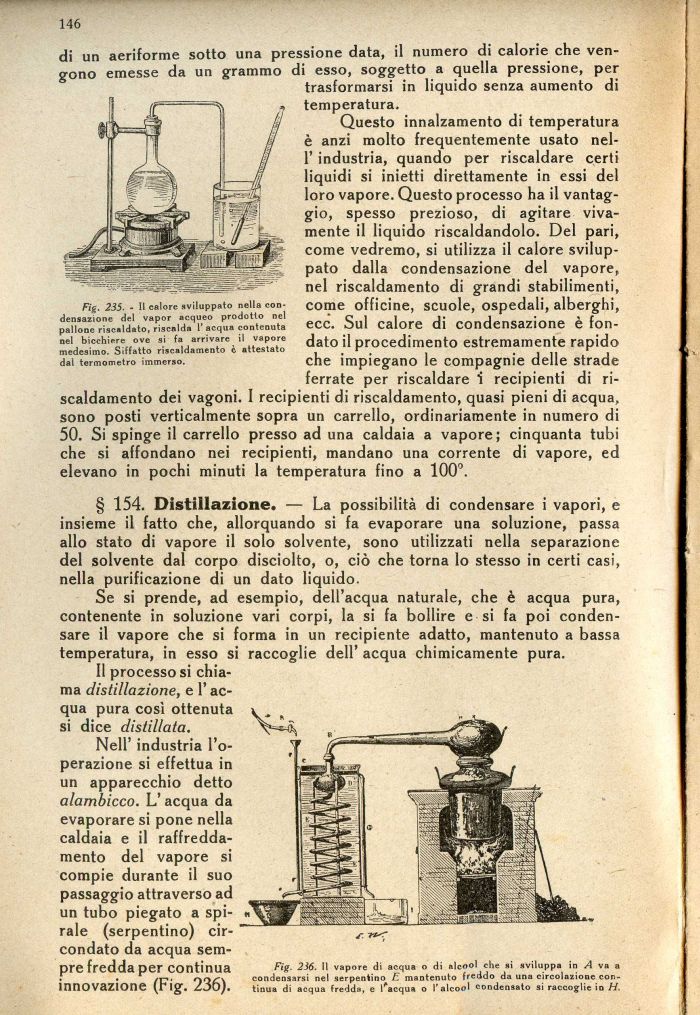 § 154. Distillazione. — La possibilità di condensare i vapori, e insieme il fatto che, allorquando si fa evaporare una soluzione, passa allo stato di vapore il solo solvente, sono utilizzati nella separazione del solvente dal corpo disciolto, o, ciò che torna lo stesso in certi casi, nella purificazione di un dato liquido.